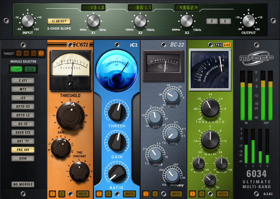 The 6034 Ultimate Multi-band is a flexible multi-band dynamics processor, offering all the award-winning compression, expansion, and gating modules from the highly acclaimed 6050 Ultimate Channel Strip plug-in, in a four band crossover network. Just like the 6050 modules, the 6034 Ultimate Multi-band modules can be swapped on the fly for quick auditioning while retaining relative settings. The crossover filter slopes can be configured as 6, 12, or 24 dB/Oct. Metering includes gain reduction and output levels on all crossover bands, as well as main input and output levels.