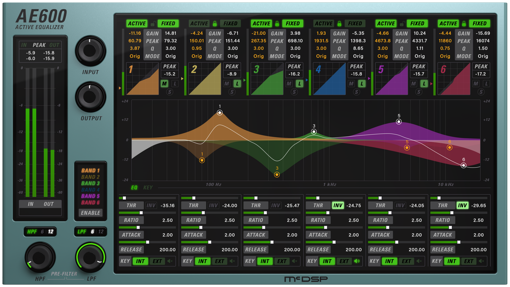 Peak signal text readouts for each active EQ band’s key signal allow quick setup of each band’s active EQ threshold, and are located underneath band dynamics plots. Input and Output controls, individual band bypass, band control linking, and band key signal monitoring round out the features of the AE600.