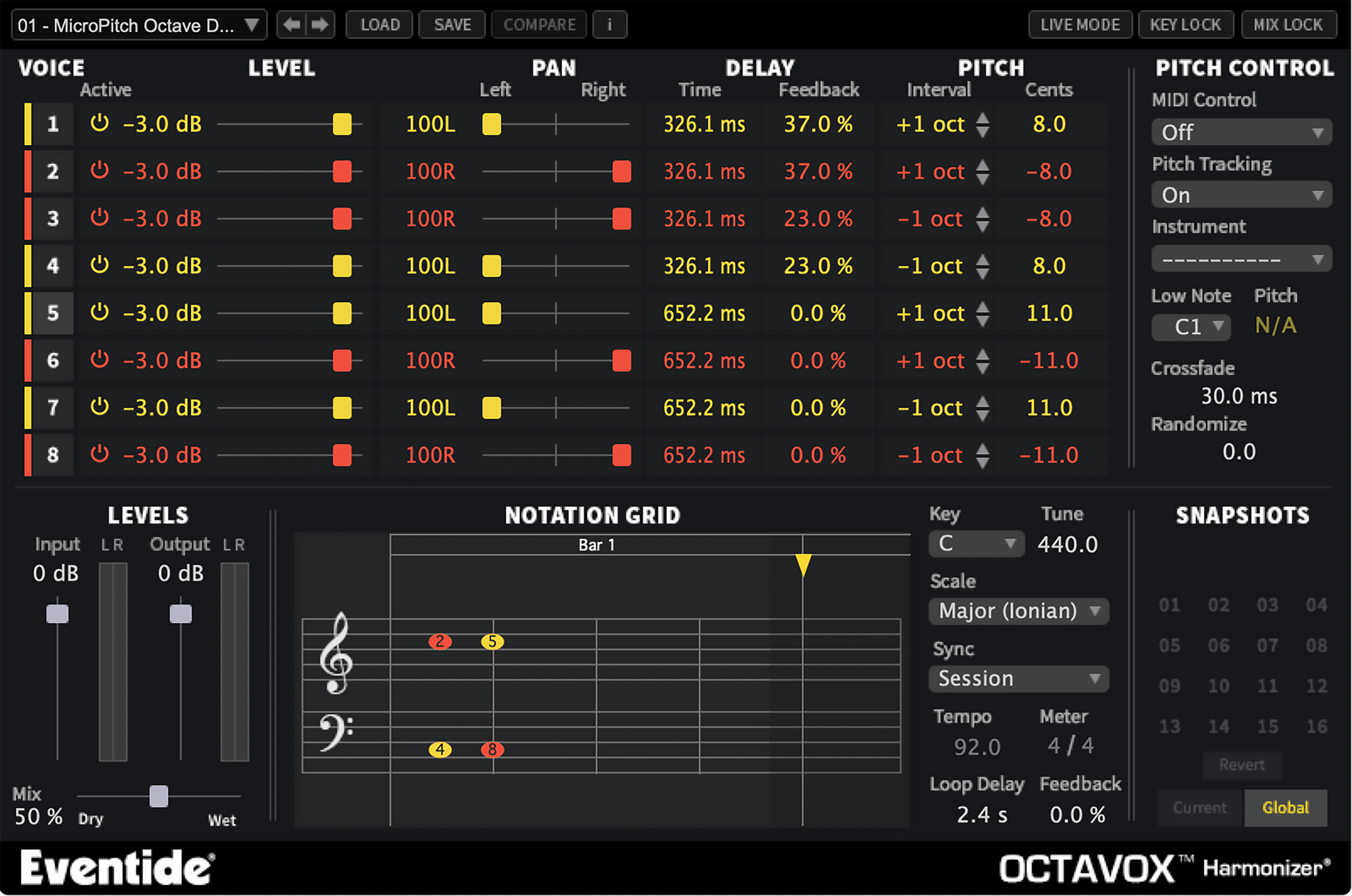 Octavox is an inspiring tool that takes any incoming tones—even drums—and outputs up to eight voices based on the chosen key and timing interval.Features:8-voice diatonic pitch shifter based on technology from Eventide’s flagship H8000 effects processor.Independent manipulation of key, timing, panning, delay, detune, and feedback for each voice.Notation Grid presents pitches on a traditional music staff with a quantized grid for a musical programming experience.Pitch-tracking ‘off’ mode allows it to shine on polyphonic and rhythmic sounds.Updated and expanded MIDI functionality so that each voice interval can be set via MIDI note making it easy to use in live performance to manipulate incoming signals.Over 70 presets optimized for a variety of instruments.Innovative MixLock function allows you to quickly audition presets while keeping the wet/dry mix level static.
