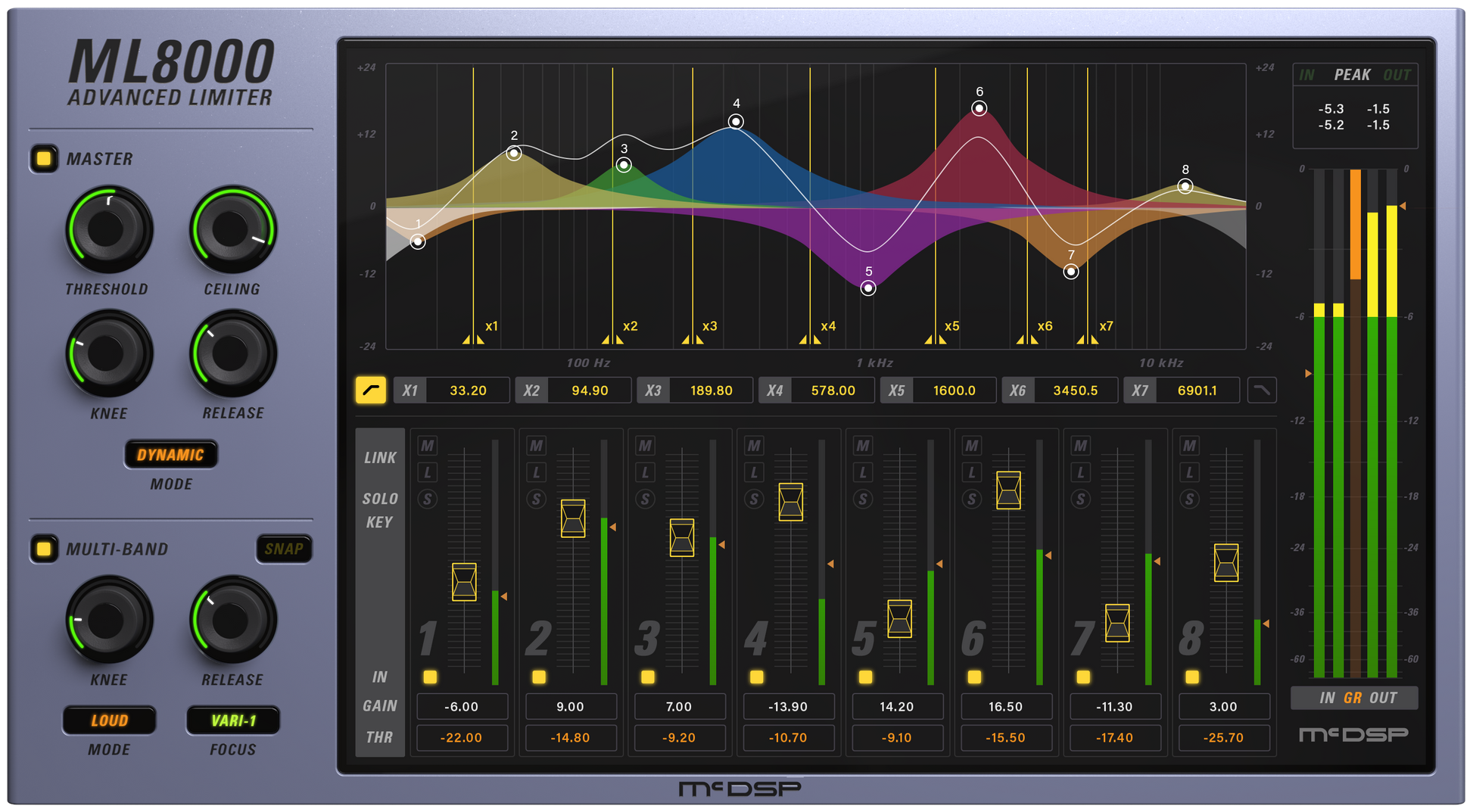 The first stage of the ML8000, the Multi-band Limiter, uses 8 bands of active processing for superior phase response over traditional cross-over based processing. Each band has its own gain and threshold (output ceiling) control. Additional overall band controls include release time and limiter modes, calibrated similarly to the modes of the original highly acclaimed McDSP ML4000 limiter. An additional focus mode provides subtle articulation changes in how each band tracks and limits the incoming signal.