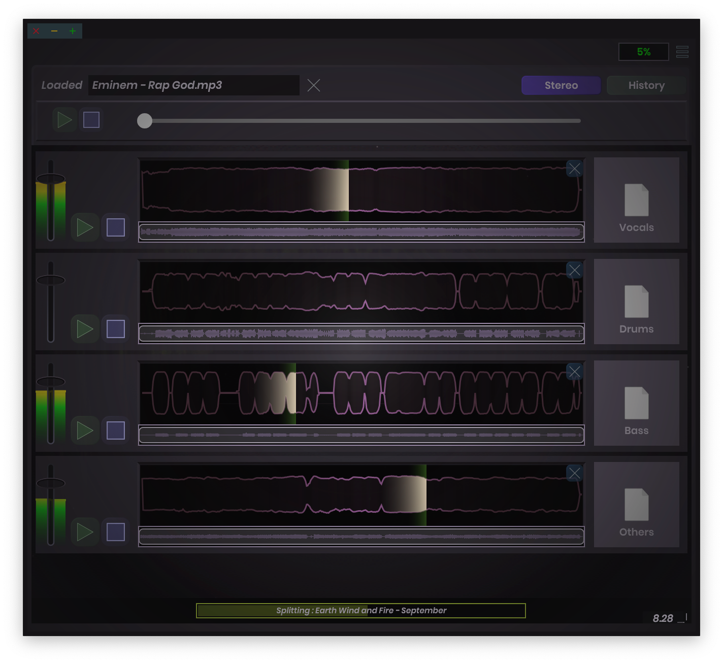 Simple Stems is extremely easy to use! It runs as a standalone or plugin (VST3/AU/AAX). To get new stems you simply drop your audio on the splitter, wait a moment for the stems to appear, and then drag the stems directly to your DAW or desktop. Get new stems without leaving your flow or hopping online! File are automatically created in a folder right beside the original audio, so you can always find them later.